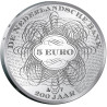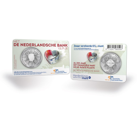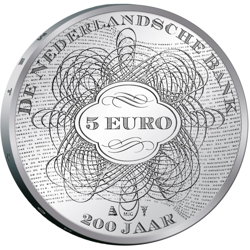 De geometrische golven op de achtergrond symboliseren het verstrijken van de tijd. De golven bevatten kleine letters die alleen zichtbaar zijn door vergroting, vergelijkbaar met het systeem dat voor bankbiljetten wordt gebruikt. De Nederlandse Bank vijf euro munt is een grafisch kunstwerk dat ons herinnert aan onze monetaire geschiedenis nu we het 200-jarig bestaan van de Nederlandse Bank vieren.