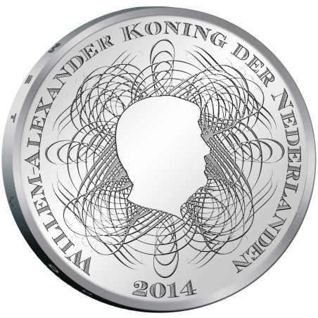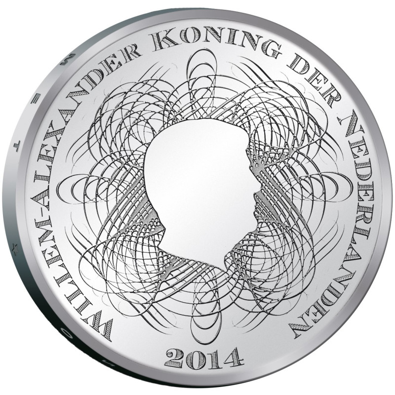 Op de voorzijde van de herdenkingsmunt staat een silhouet van Koning Willem-Alexander in een verfijnde kalligrafiestijl. Dit was vroeger een veiligheidsmaatregel die op bankbiljetten werd toegepast.