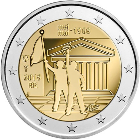 De eerste speciale 2 euromunt voor België 2018 is gewijd aan 50 jaar studentenrevolte in mei 1968. Op de voorkant van de munt staan twee studenten. Een student zwaait met een vlag en de andere met een manifest. Op de achtergrond staat een Griekse Aula afgebeeld. Links staat het muntjaar '2018' en daaronder de afkorting voor België: 'BE'.