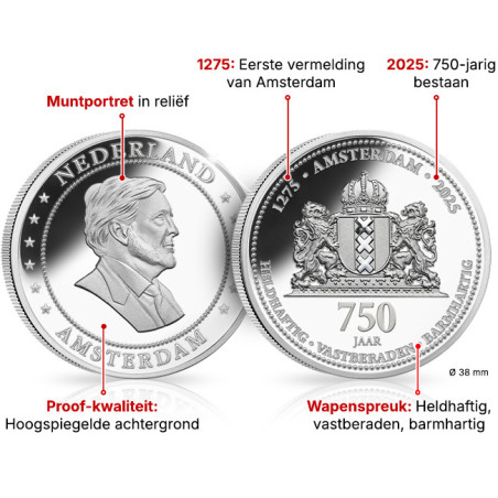 De zwaar verzilverde herdenkingsuitgifte 750 jaar Amsterdam is speciaal ontworpen als stijlvol eerbetoon aan het jubileum van onze hoofdstad. Eeuwenlang vervulde Amsterdam een vooraanstaande rol in de wereldgeschiedenis. De stad groeide uit tot een centrum van cultuur en handel, rijk aan iconisch erfgoed met internationale allure. Deze statige uitgifte verzilvert die oude glorie op een tijdloze manier en vervult menig verzamelaar met trots.