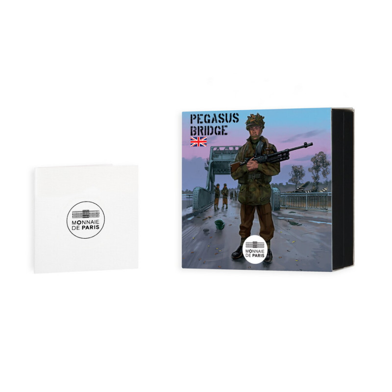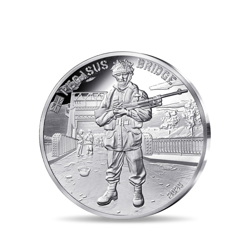 Richard, een Brits zweefvliegtuig van de Airlanding Brigade, maakte deel uit van de 6th Airborne (Brits en Canadees). Hij landde in de nacht van 6 juni 1944 in een zweefvliegtuig ten oosten van Sword Beach. Hier poseert hij voor de Pegasus Bridge na de succesvolle voltooiing van operatie Deadstick. Het zweefvliegtuig waarin hij landde staat op de achtergrond onder de bomen. In de nacht van 5 op 6 juni 1944, tijdens Operatie Tonga, waren eenheden van de 6de Divisie de eersten die vochten tijdens de landing in Normandië. Ze werden gedropt door zweefvliegtuigen en parachuteerden achter Sword Beach om de oostflank van de geallieerde landingszone veilig te stellen. Hun doelen waren onder andere de verovering van Pegasus Bridge en de brug over de rivier de Orne, evenals de vernietiging van de Merville batterij - die allemaal werden bereikt. Operatie Tonga ging verder met de parachutering van verdere divisie-eenheden om de sector te behouden en Duitse offensieven tegen te gaan. Op de achterkant van deze munt staan alle geallieerde landen die officieel deelnamen aan de landing in Normandië, omringd door de nominale waarde en de RF initialen. Met de klok mee: France Libre, Nederland, Nieuw-Zeeland, Polen, Australië, VS, Noorwegen, UK, Tsjecho-Slowakije, Canada, België