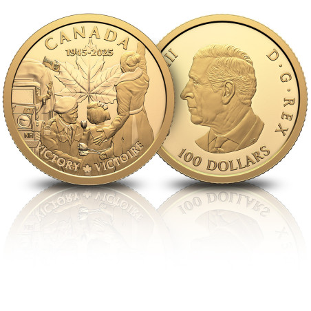 Ter ere van 80 jaar bevrijding van Nederland brengt de Royal Canadian Mint een exclusieve gouden munt uit. Het ontwerp toont een Canadees soldaat die in 1945 als held wordt ontvangen in een bevrijde Nederlandse stad. Een jong meisje overhandigt hem een tulp – symbool van dankbaarheid en vriendschap tussen Nederland en Canada. De voorzijde toont het portret van koning Charles III, ontworpen door de Canadese kunstenaar Steven Rosati.