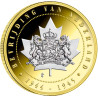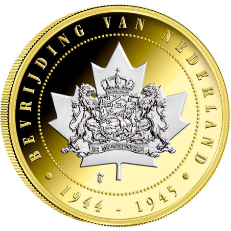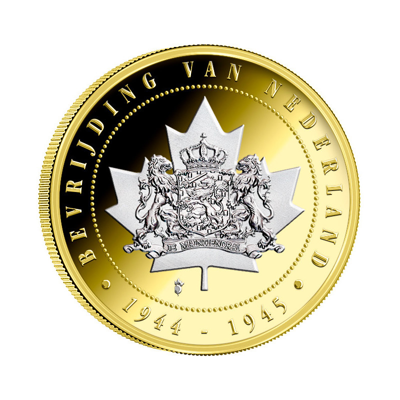 Het ontwerp op de achterzijde weerspiegelt de historische verbondenheid tussen Nederland en Canada, dat grote delen van ons land heeft bevrijd. Hun nationale symbolen – het Nederlandse Rijkswapen en het Canadese esdoornblad – stralen eendracht voor vrede en vrijheid uit.