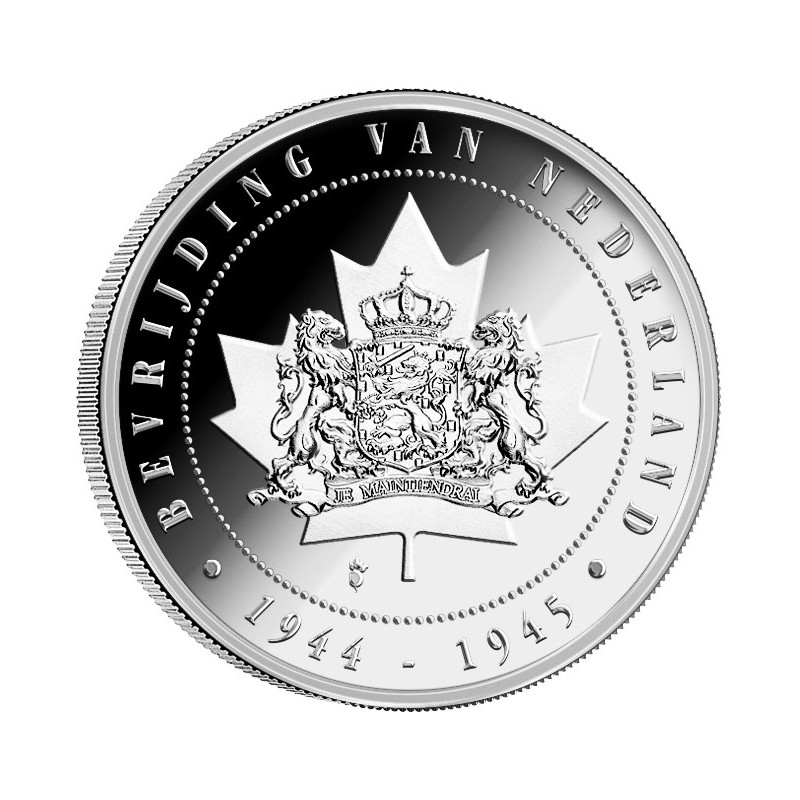 Het ontwerp op de achterzijde weerspiegelt de historische verbondenheid tussen Nederland en Canada, dat grote delen van ons land heeft bevrijd. Hun nationale symbolen – het Nederlandse Rijkswapen en het Canadese esdoornblad – stralen eendracht voor vrede en vrijheid uit.
