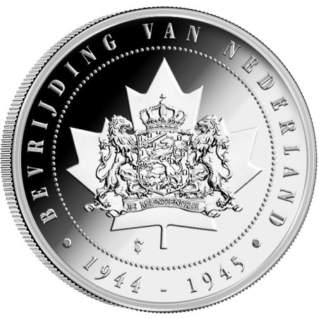 Het ontwerp op de achterzijde weerspiegelt de historische verbondenheid tussen Nederland en Canada, dat grote delen van ons land heeft bevrijd. Hun nationale symbolen – het Nederlandse Rijkswapen en het Canadese esdoornblad – stralen eendracht voor vrede en vrijheid uit.