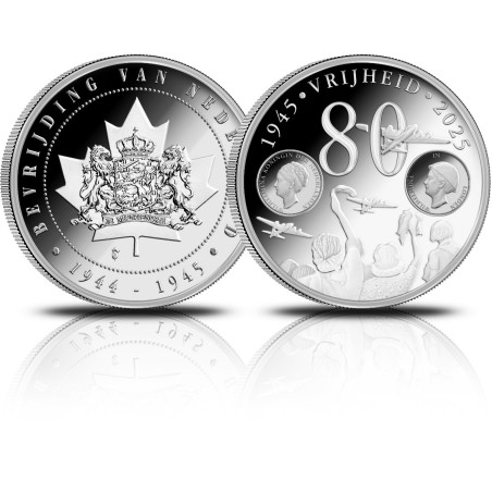 Het ontwerp op de achterzijde weerspiegelt de historische verbondenheid tussen Nederland en Canada, dat grote delen van ons land heeft bevrijd. Hun nationale symbolen – het Nederlandse Rijkswapen en het Canadese esdoornblad – stralen eendracht voor vrede en vrijheid uit.