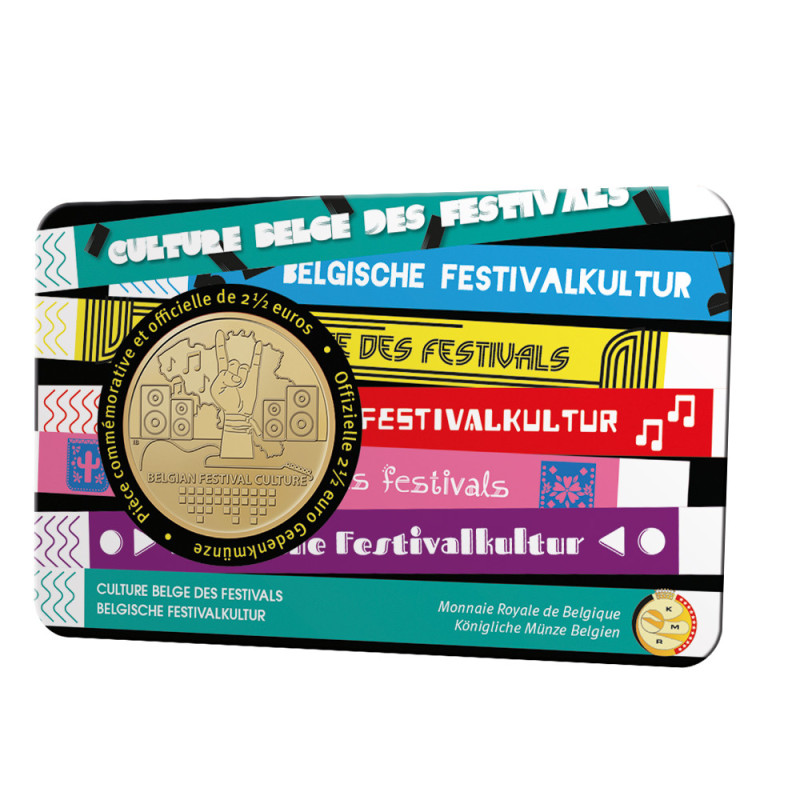 België, met meer dan 11,6 miljoen inwoners op 30.688 km2, mag dan een klein land zijn, we hebben wel de meeste festivals per hoofd van de bevolking ter wereld! België weet als geen ander hoe je een goed festival organiseert. Tomorrowland, Pukkelpop, Rock Werchter: het zijn maar enkele van de bekende Belgische festivals. Naast deze grote namen vinden er ook honderden kleinere festivals plaats. Kortom: keuze genoeg voor de festivalliefhebber! En de tickets voor het komende festivalseizoen zijn nu al erg in trek. Reden genoeg voor de Koninklijke Munt van België om een munt van 2½ euro uit te geven met als thema 'Belgische festivalcultuur'. De 2½ euro is geslagen in BU-kwaliteit en verschijnt in een coincard met twee taalversies. Op de muntkaart staan verschillende festivalarmbandjes afgebeeld, die vaak als toegangskaart voor festivals worden gebruikt en door velen worden verzameld. Op de munt gaat een hand omhoog die het 'rock on'-gebaar maakt, omgeven door concertprekers, muzieknoten, een gitaar, een equalizer onderaan en de kaart van België op de achtergrond.