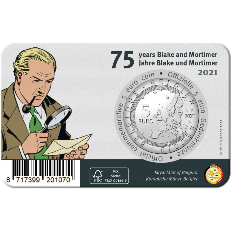 Op deze gekleurde 5 Euro Herdenkingsmunt zijn de populaire stripfiguren Blake en Mortimer in kleur afgebeeld.