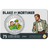 Op deze gekleurde 5 Euro Herdenkingsmunt zijn de populaire stripfiguren Blake en Mortimer in kleur afgebeeld.