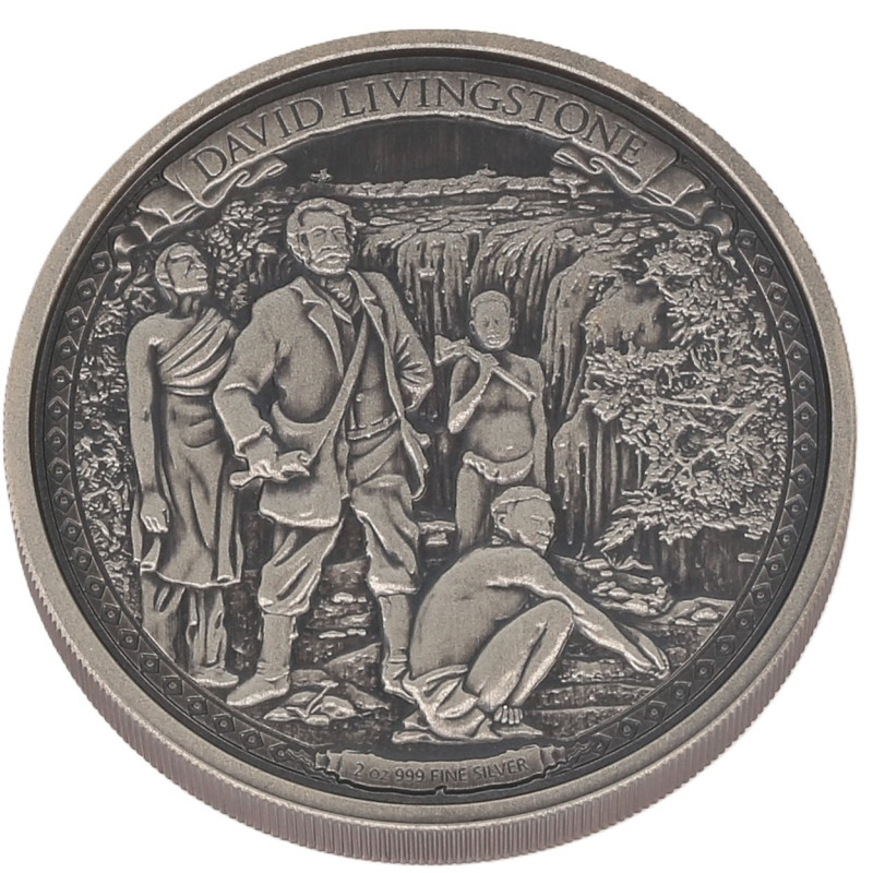 David Livingstone was een missionaris en een legendarische ontdekkingsreiziger van het Afrikaanse continent, een van de populairste nationale helden van Groot-Brittannië aan het eind van de 19e eeuw. Deze reliëfgegraveerde, antiek afgewerkte munt, toont een artistieke interpretatie van David Livingstone staand samen met zijn verkenningstroepen voor de adembenemend mooie Victoria watervallen.