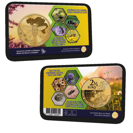 With the issue of this second 2½ euro coin of 2024, the Royal Mint of Belgium emphasises the ecological importance of our bees and at the same time reminds us of the urgent need to protect their unique biodiversity against the pollution of our environment and the derailment of our climate. The image side features a bee and a stylised cherry blossom with the Belgian map in the form of a honeycomb behind it. This map becomes more or less visible when you move the coin. The coin side shows the face value, the year and the European map, surrounded by the trilingual caption BELGIË-BELGIQUE-BELGIEN.