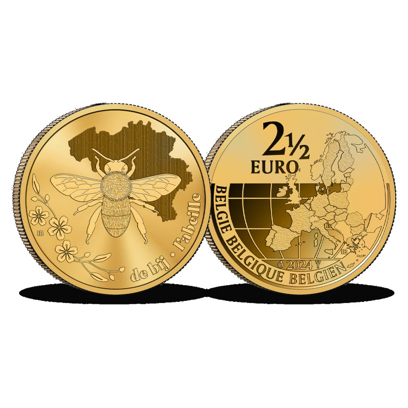 With the issue of this second 2½ euro coin of 2024, the Royal Mint of Belgium emphasises the ecological importance of our bees and at the same time reminds us of the urgent need to protect their unique biodiversity against the pollution of our environment and the derailment of our climate. The image side features a bee and a stylised cherry blossom with the Belgian map in the form of a honeycomb behind it. This map becomes more or less visible when you move the coin. The coin side shows the face value, the year and the European map, surrounded by the trilingual caption BELGIË-BELGIQUE-BELGIEN.
