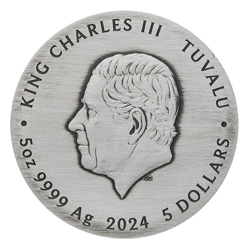 Deze betoverende antiekgekleurde 5oz zilveren munt met de tinten en oppervlakteschaafplekken van een oud artefact toont de draak en het ontwerp van de vijf elementen in uitzonderlijk detail. De draak is het vijfde jaarteken in de 12-jarige cyclus van de maankalender. Vereerd in de Aziatische cultuur als een goddelijk, Er wordt gezegd dat de draak ambitie, charisma en succes schenkt aan degenen die onder zijn bescherming zijn geboren. Net als alle tekens in de maans dierenriem wordt het gunstige mythische wezen geassocieerd met vijf fundamentele elementen - hout, vuur, aarde, metaal en water. Volgens de Chinese filosofie van Wuxing (Vijf Elementen Theorie), is de eb en vloed van deze onderling verbonden elementen verantwoordelijk voor de verandering van alle dingen in de kosmos. In de maanastrologie gelooft men dat de elementen om beurten het lot van mensen die onder elk teken. In 2024 wordt de draak beïnvloed door hout - van 'houtdraken' wordt dan ook gedacht dat ze warm, wijs, gul en meelevend zijn. De Draak en de Vijf Elementen 2024 5oz Silver Antiqued Coloured Coin is geslagen door The Perth Mint uit 99,99% puur zilver en uitgegeven als wettig betaalmiddel onder het gezag van de regering van Tuvalu. De Perth Mint zal niet meer dan 500 van de Dragon and the Five Elements 2024 5oz Silver Antiqued Gekleurde Munten