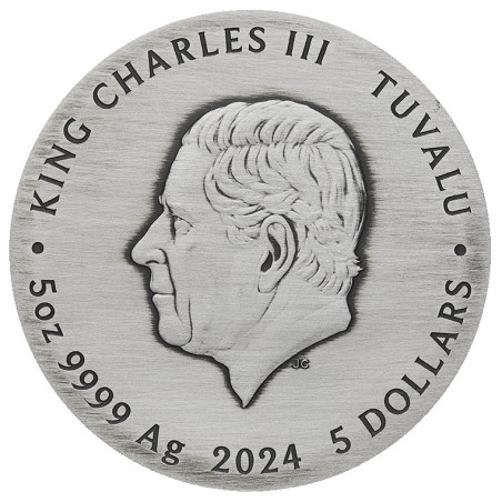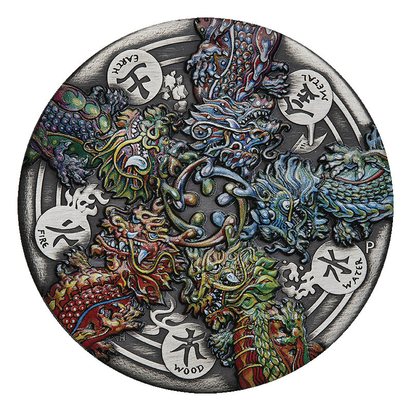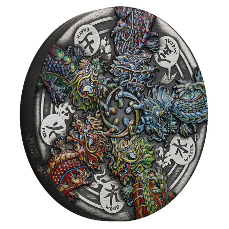 Deze betoverende antiekgekleurde 5oz zilveren munt met de tinten en oppervlakteschaafplekken van een oud artefact toont de draak en het ontwerp van de vijf elementen in uitzonderlijk detail. De draak is het vijfde jaarteken in de 12-jarige cyclus van de maankalender. Vereerd in de Aziatische cultuur als een goddelijk, Er wordt gezegd dat de draak ambitie, charisma en succes schenkt aan degenen die onder zijn bescherming zijn geboren. Net als alle tekens in de maans dierenriem wordt het gunstige mythische wezen geassocieerd met vijf fundamentele elementen - hout, vuur, aarde, metaal en water. Volgens de Chinese filosofie van Wuxing (Vijf Elementen Theorie), is de eb en vloed van deze onderling verbonden elementen verantwoordelijk voor de verandering van alle dingen in de kosmos. In de maanastrologie gelooft men dat de elementen om beurten het lot van mensen die onder elk teken. In 2024 wordt de draak beïnvloed door hout - van 'houtdraken' wordt dan ook gedacht dat ze warm, wijs, gul en meelevend zijn. De Draak en de Vijf Elementen 2024 5oz Silver Antiqued Coloured Coin is geslagen door The Perth Mint uit 99,99% puur zilver en uitgegeven als wettig betaalmiddel onder het gezag van de regering van Tuvalu. De Perth Mint zal niet meer dan 500 van de Dragon and the Five Elements 2024 5oz Silver Antiqued Gekleurde Munten
