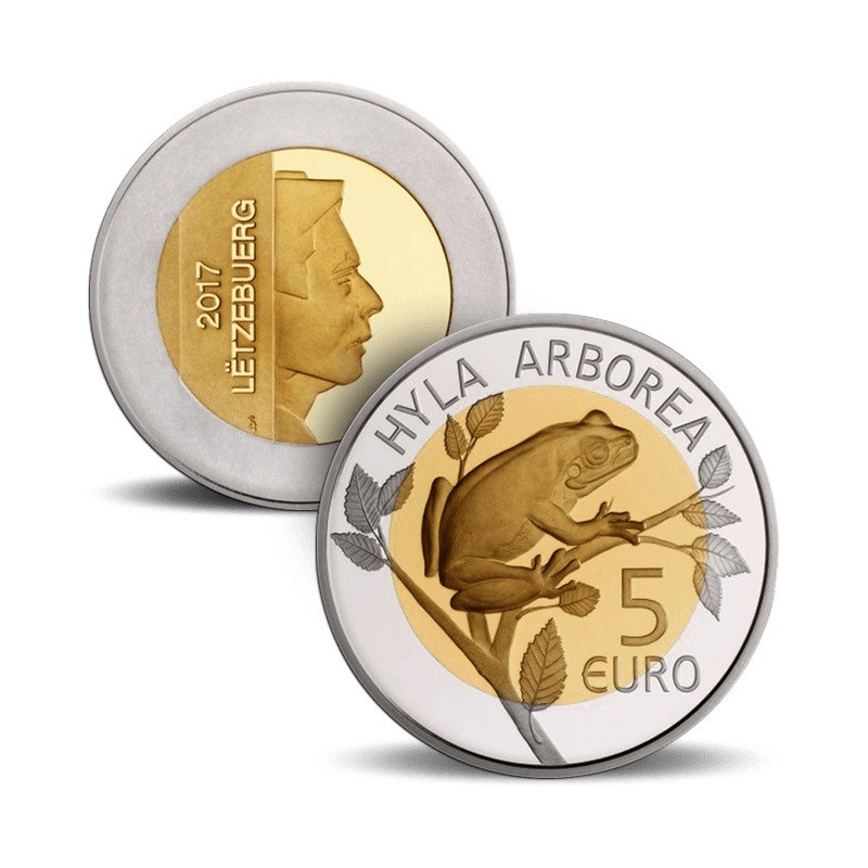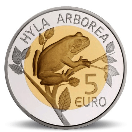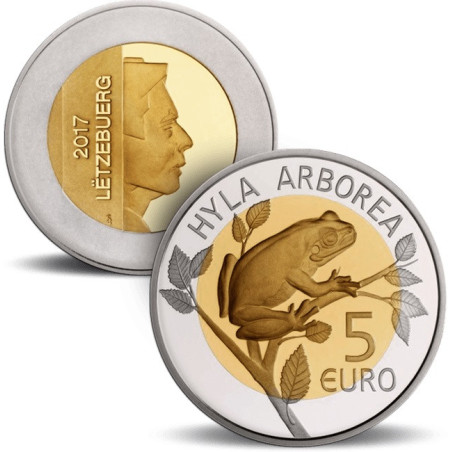 Deze 5 euro Herdenkingsmunt uit Luxemburg heeft een ring van schitterend Sterling zilver met in het midden een kern van Nordic Gold. Op de munt is de Europese Boomkikker met veel finesse afgebeeld en een klein deel van de leefomgeving. Aan de bovenkant zien we de latijnse naam HYLA ARBOREA. Doordat de munt is geslagen in de hoogst mogelijke verzamelkwaliteit, kunt u de details extra goed aanschouwen.