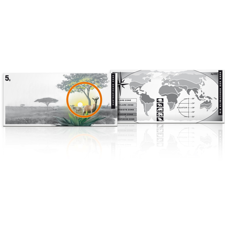 Rechts bovenaan staat het zilvergehalte "Ag 999" en verticaal de tekst "DIE KLIMAZONEN DER ERDE" (de klimaatzones op aarde).