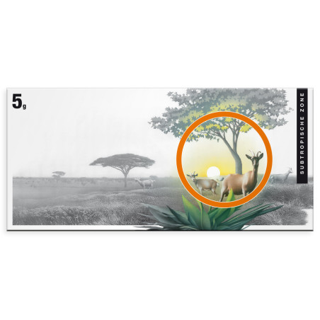 Op deze puur zilveren Flat Bar uitgifte in de muntkwaliteit ‘Uncirculated’ staat de Antilope centraal. Ze leven op de savannes, op het heetst van de dag zoeken ze de schaduw op. Het belangrijkste voedsel is kort tot middelhoog gras, aangevuld met bladeren en scheuten van bomen en struiken en de peulen van de Acacia. Ze wagen zich zelden ver van water.