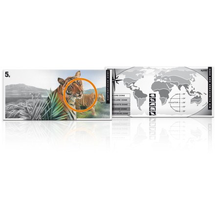 Op deze puur zilveren Flat Bar uitgifte in de muntkwaliteit ‘Uncirculated’ staat de Bengaalse tijger centraal. De Bengaalse tijger of koningstijger is een ondersoort van de tijger die voorkomt op het Indisch subcontinent. De vacht van de Bengaalse tijger is oranjebruin tot oranjegeel met verticale bruine tot zwarte strepen. Dit strepenpatroon verschilt in aantal, dikte en vertakkingen per individu. De Bengaalse tijger jaagt voornamelijk 's nachts en in de schemering. Hij jaagt onder andere op diverse soorten herten, varkens, antilopes, apen, runderen en zelfs jonge olifanten.