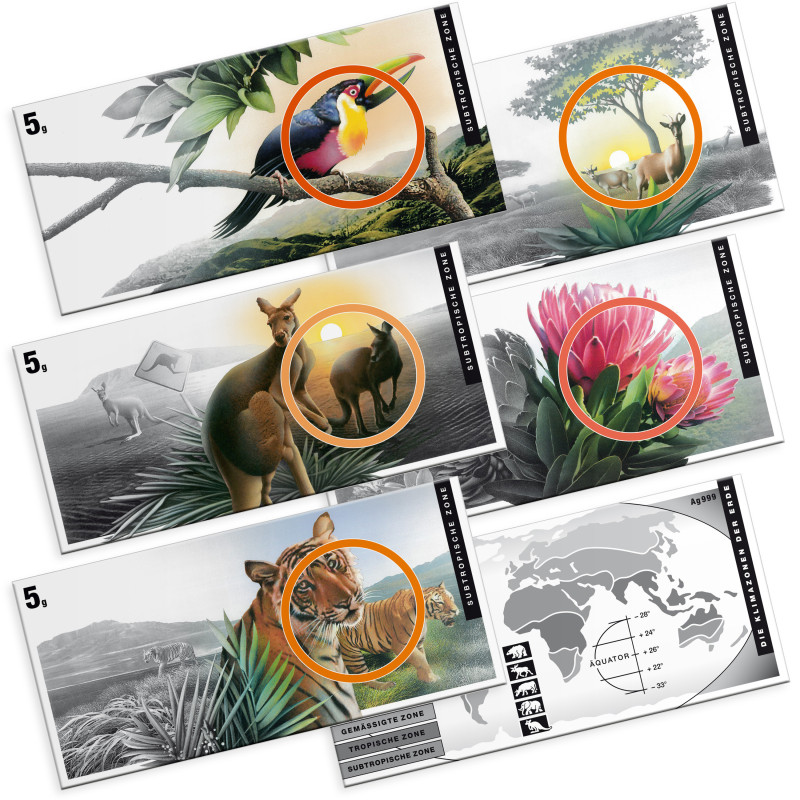De set bevat alle vijf de Flat Bars in de "Subtropical Zone" serie. Deze puur zilveren herdenkingsuitgiften staan in het teken van de antilope, Bengaalse tijger, kangoeroe, toekan en Protea (ook wel Suikerbos genoemd). Op de andere kant van elke uitgifte zien we de wereldkaart met in verschillende grijstinten alle klimaatzones. Per zone is een groot zoogdier afgebeeld. Van boven naar beneden zijn dat de IJsbeer, Eland, Rund, Olifant en Kangoeroe. Rechts bovenaan staat het zilvergehalte "Ag 999" en verticaal de tekst "DIE KLIMAZONEN DER ERDE", wat "De klimaatzones op aarde" betekent.