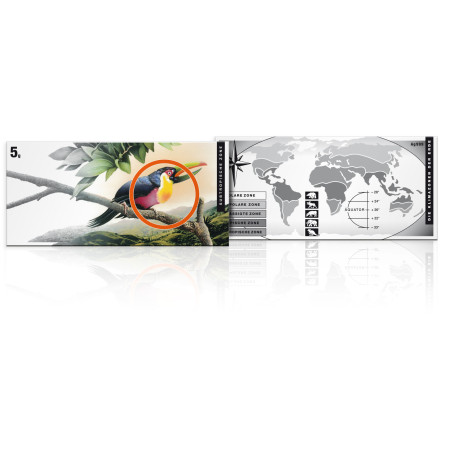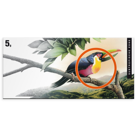 Op deze puur zilveren Flat Bar uitgifte in de muntkwaliteit ‘Uncirculated’ staat de Toekan centraal. Het opvallendste kenmerk van de toekan is de grote maar toch vederlichte veelkleurige snavel, die soms half zo lang is als het dier zelf, maar meestal ongeveer een derde van zijn lichaamslengte bedraagt. Toekans voeden zich voornamelijk met vruchten, en soms ook met insecten en spinnen. Ze roven ook weleens vogelnesten leeg.