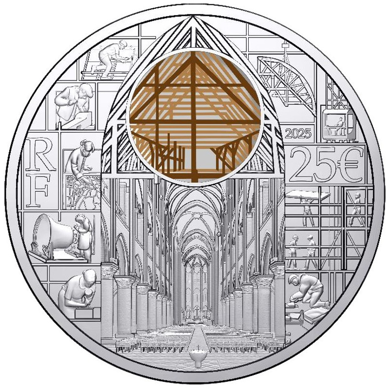 The round coins from this collection highlight the rebuilding of the cathedral. The intersecting lines around the front of Notre Dame symbolize the presence of scaffolding, on which the text «Rebâtir Notre-Dame» (Rebuilding Notre-Dame) rests. Each letter of the text is placed on a different level of the scaffolding, like a series of bricks depicting the different crafts involved in the reconstruction. Each of these trades helps to reconstruct the message, like links in a chain. On the reverse is focus on the men and women working on the Notre-Dame construction site. Illustrations by artist Arthur Bonifay highlight the craftsmen and women who helped rebuild the Gothic cathedral to its original state. Carpenters, crane operators, stone masons, scaffolders... Today's craftsmen and master craftsmen pay tribute to the cathedral's original builders. They perpetuate age-old gestures while using more modern techniques. Through their work, they help to pass on their exceptional know-how.
