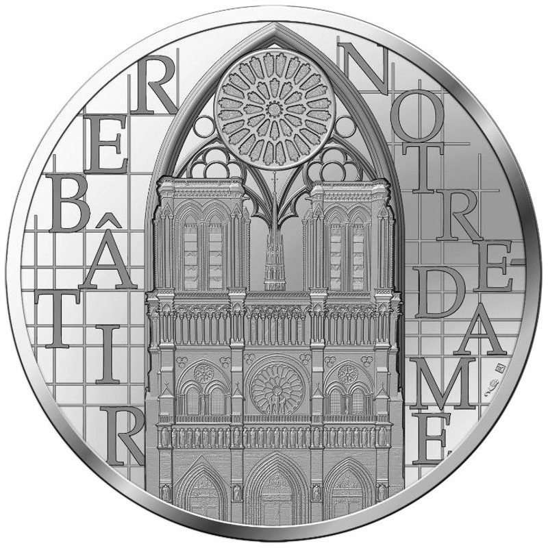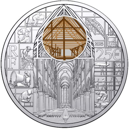 The round coins from this collection highlight the rebuilding of the cathedral. The intersecting lines around the front of Notre Dame symbolize the presence of scaffolding, on which the text «Rebâtir Notre-Dame» (Rebuilding Notre-Dame) rests. Each letter of the text is placed on a different level of the scaffolding, like a series of bricks depicting the different crafts involved in the reconstruction. Each of these trades helps to reconstruct the message, like links in a chain. On the reverse is focus on the men and women working on the Notre-Dame construction site. Illustrations by artist Arthur Bonifay highlight the craftsmen and women who helped rebuild the Gothic cathedral to its original state. Carpenters, crane operators, stone masons, scaffolders... Today's craftsmen and master craftsmen pay tribute to the cathedral's original builders. They perpetuate age-old gestures while using more modern techniques. Through their work, they help to pass on their exceptional know-how.