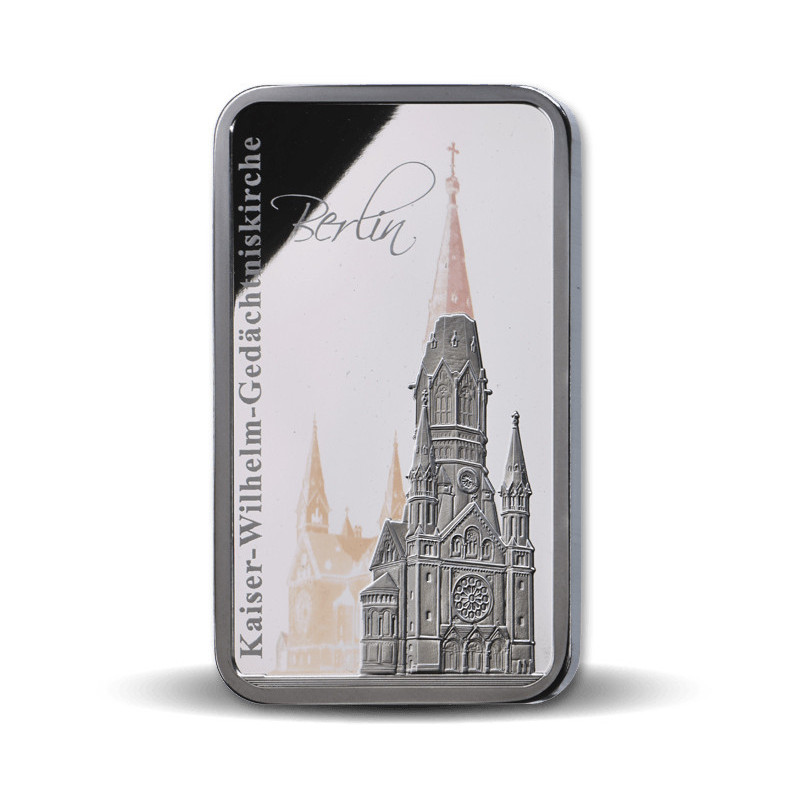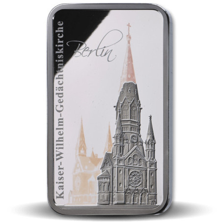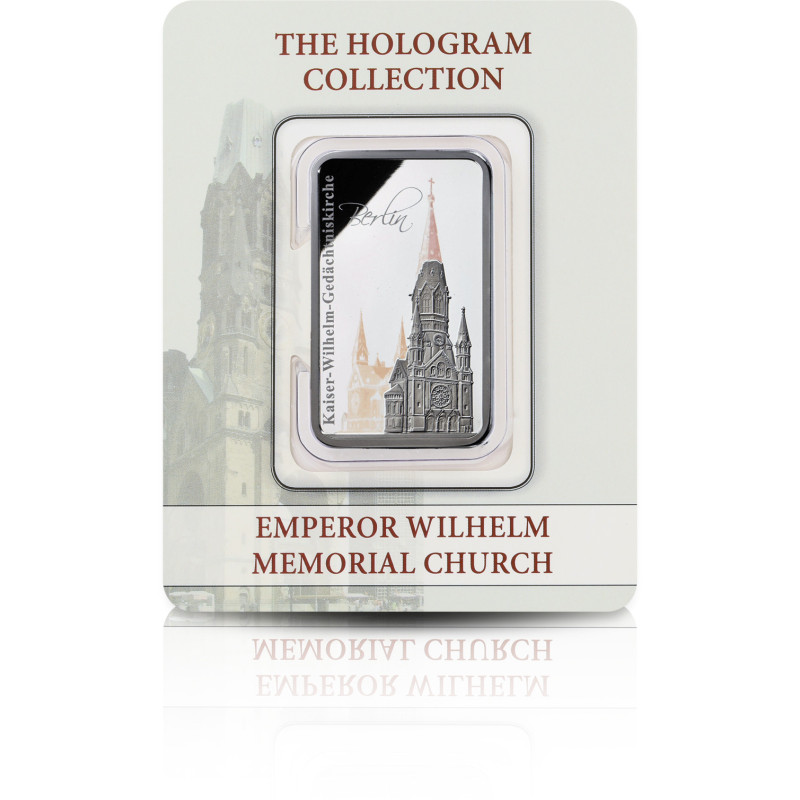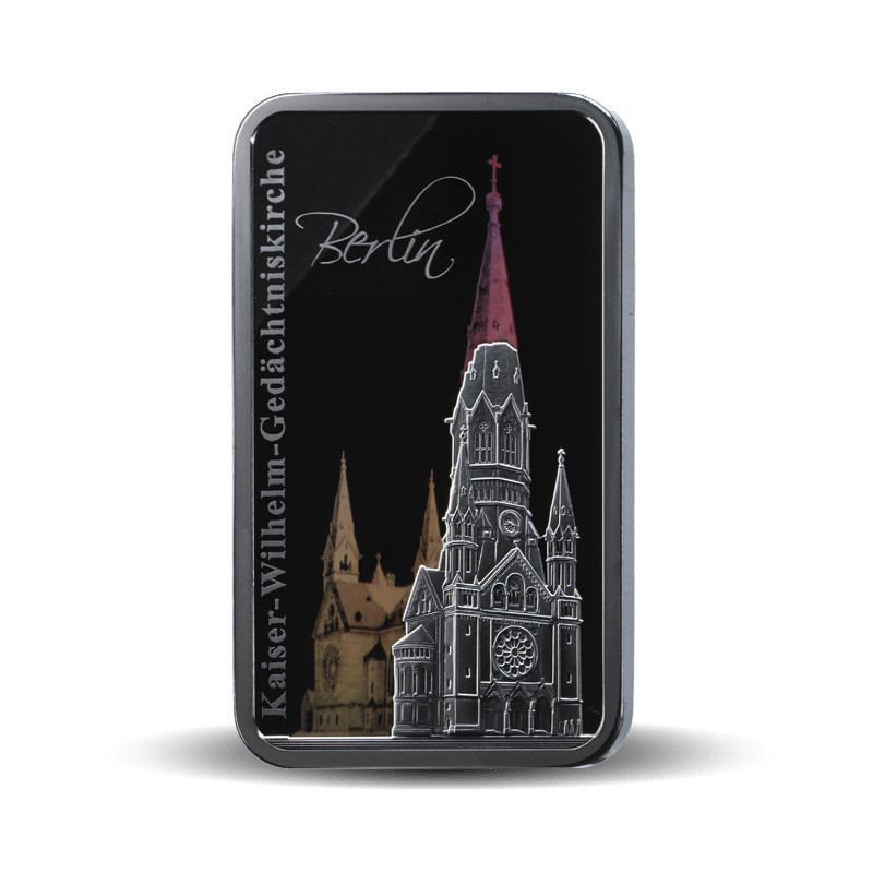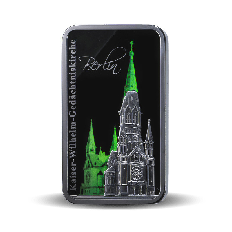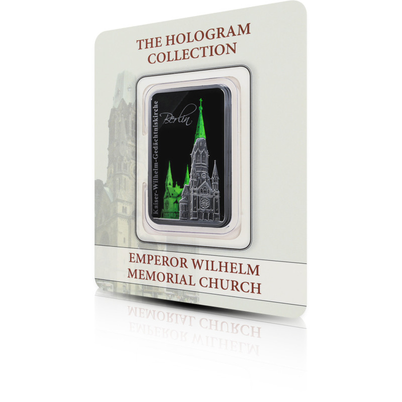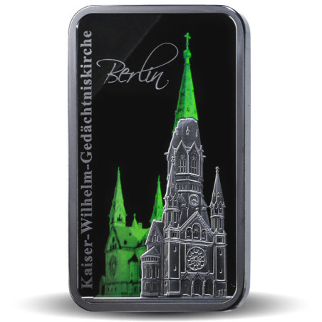 Dit is een prachtige zilveren munt van 1 oz, de keerzijde van de munt toont de Kaiser Wilhelm Memorial Church en heeft een deel van de kerk nagemaakt met een hologramtechniek.