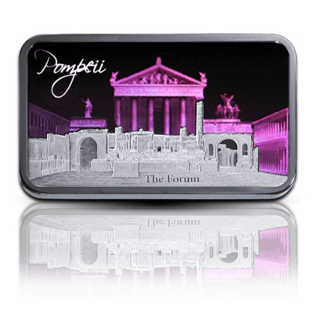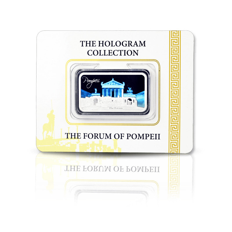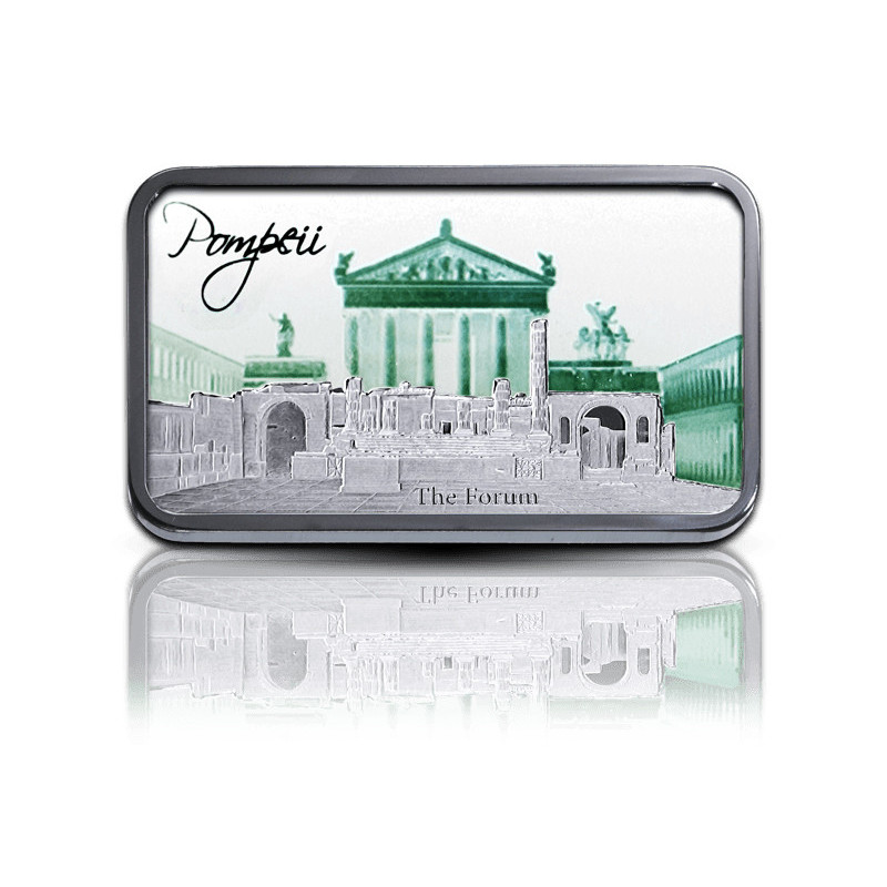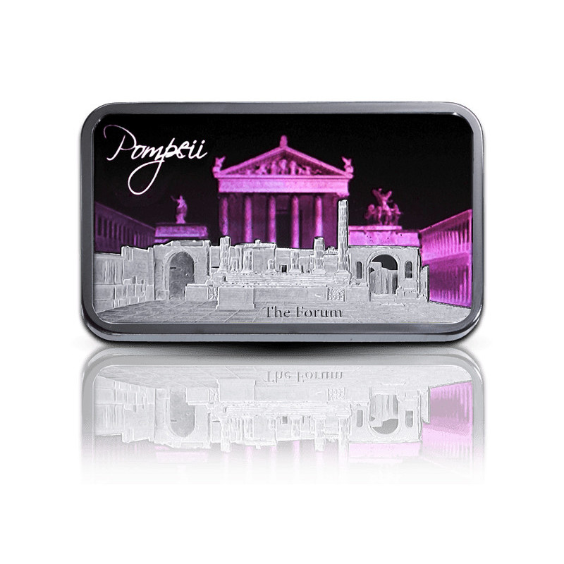 Deze zilveren munt toont het Forum van Pompeii in Zuid-Italië. Helaas werd dit beroemde bouwwerk in de eerste eeuw na Christus bedekt met een vier meter dikke laag vulkanische as nadat een fatale uitbarsting van de vulkaan Vesuvius duizenden mensen het leven had gekost. Op deze munt zijn de ruïnes aangevuld met holografische technologie, zodat je het Forum van Pompeii kunt zien zoals de Romeinen het al die eeuwen geleden hadden gebouwd.
