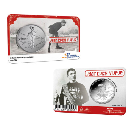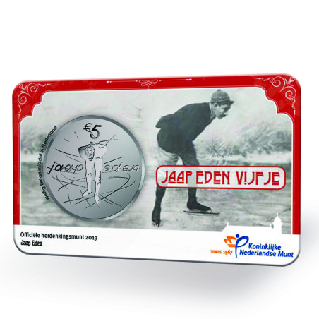 De laatste herdenkingsmunt van 2019 is een eerbetoon aan het Nederlandse sporticoon Jaap Eden (1873 - 1925). Op het verzilverde Jaap Eden Vijfje staat de schaatssport centraal.