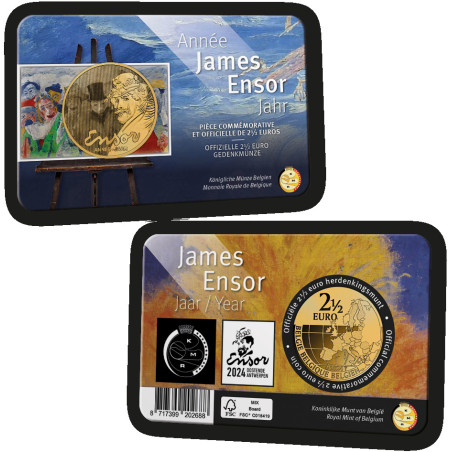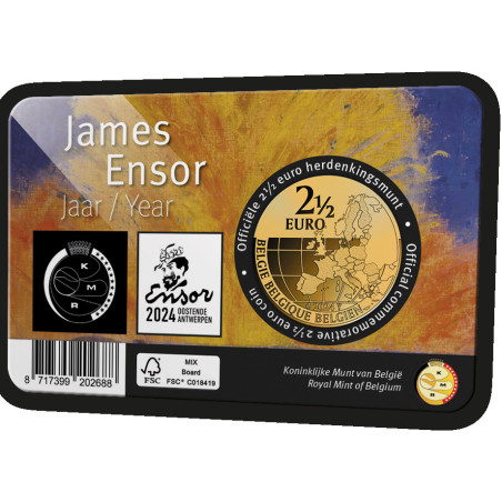 Van The Oyster Eater tot The Intrige: hoe bekender en begeerlijker/waardevoller het werk, hoe zeldzamer de NFT. Ensors werken komen tot leven met een 'glitch' of huivering! NFT: staat voor Non-Fungible Token. Een NFT is een digitaal certificaat van eigendom, opgeslagen op een blockchain, dat verwijst naar een digitaal mediaobject. Aan 2 x 5.000 muntkaarten 2 ½ euro James Ensor Year 2024 zijn QR-codes toegevoegd waarmee een NFT kan worden geclaimd. Er zit dus een exclusief extraatje bij de munten! Je ontvangt de muntkaart in een speciaal mapje met stap-voor-stap uitleg.