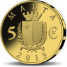 De voorzijde van de 5 Euro munt is voorzien van het huidige wapen van Malta met een muurkroon erboven, het uitgiftejaar, de herkomst en de waarde aanduiding.