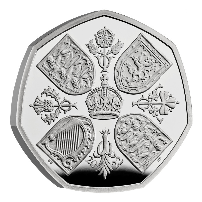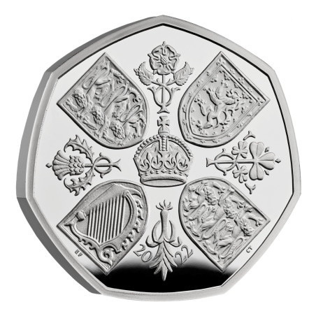 Deze speciale 50 Pence Zilver Proof munt is uitgegeven als eerbetoon aan de in 2022 overleden Koningin Elizabeth II. De munt is twee keer zo dik als de gewone 50 Pence munten, weegt 8 gram en is geslagen in eersteklas Sterling (.925) zilver.