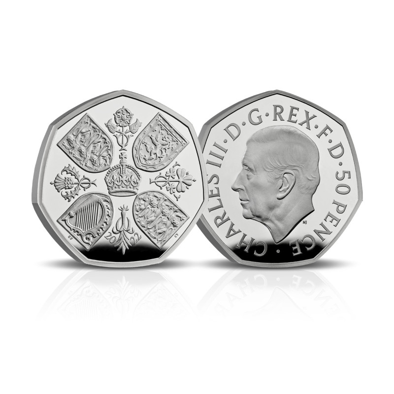 Op de achterkant van de munt staat een aangepaste versie van het kroningskroon ontwerp uit 1953, met de uitgiftedatum 2022 erin verwerkt. Rondom een centrale kroon met een roos, distel, klaver en prei in de hoeken, zijn er schilden van koninklijke wapens te zien. Onder ziet u de datum '20 22' met daartussen een prei. Op de voorkant van de munt staat het eerste officiële muntportret van de nieuwe Koning, ontworpen door Martin Jennings en persoonlijk goedgekeurd door de vorst. De Koning kijkt naar rechts, in de tegenovergestelde richting van wijlen Koningin Elizabeth II.