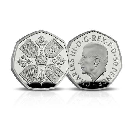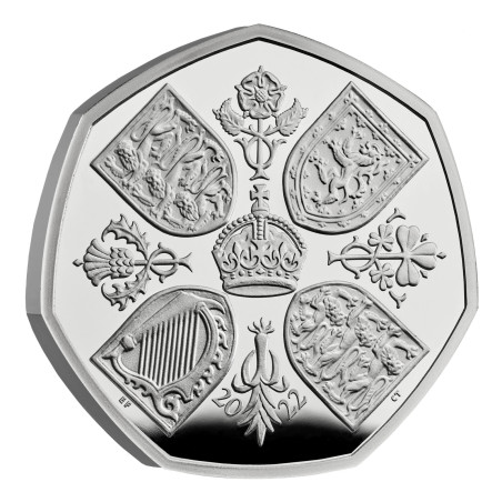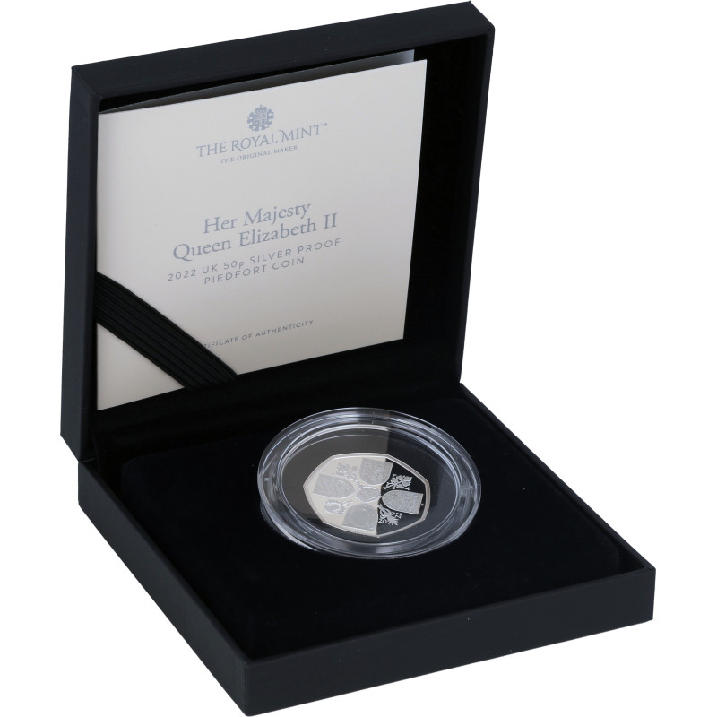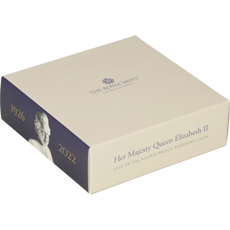 Deze speciale 50 Pence Zilver Proof Piedfort-munt is uitgegeven als eerbetoon aan de in 2022 overleden Koningin Elizabeth II. De munt is twee keer zo dik als de gewone 50 Pence munten, weegt 16 gram en is geslagen in eersteklas Sterling (.925) zilver.
