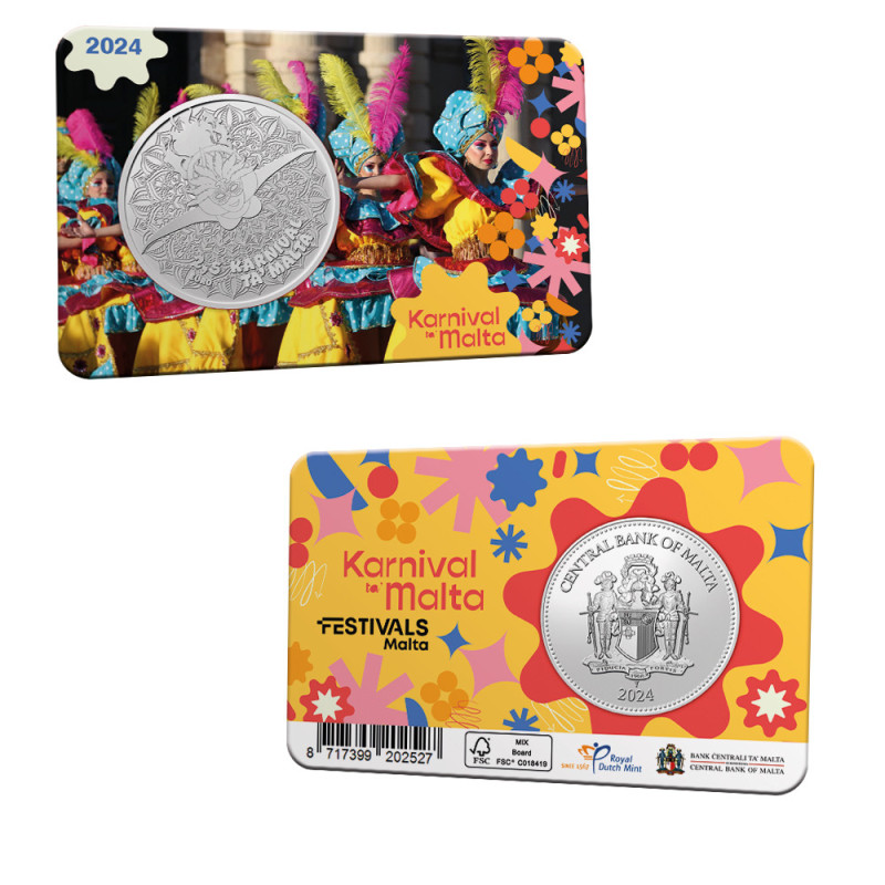 Het carnaval van Malta is al eeuwenlang een begrip: een week lang draait alles op het eiland om kleur, maskers, kostuums, muziek en vrolijkheid. Speciaal voor deze vieringen lanceert de Koninklijke Nederlandse Munt een kleurrijke uitgifte, in opdracht van de Centrale Bank van Malta.De muntkaart is een echte eyecatcher, dankzij het vrolijke ontwerp: een perfecte match met het feestelijke evenement. De voorzijde van de muntkaart heeft de afbeelding van dansende Maltese inwoners in kleurrijke kleding. Kleur, muziek en dans zijn belangrijke onderdelen van het Malta Carnaval. Onderaan staat de tekst Karnival Ta Malta, wat Malta Carnaval betekent. Aan de rechterkant van de muntkaart zijn verschillende vormen te ontdekken. Het gebruik van deze vormen is ook te zien op de achterkant.