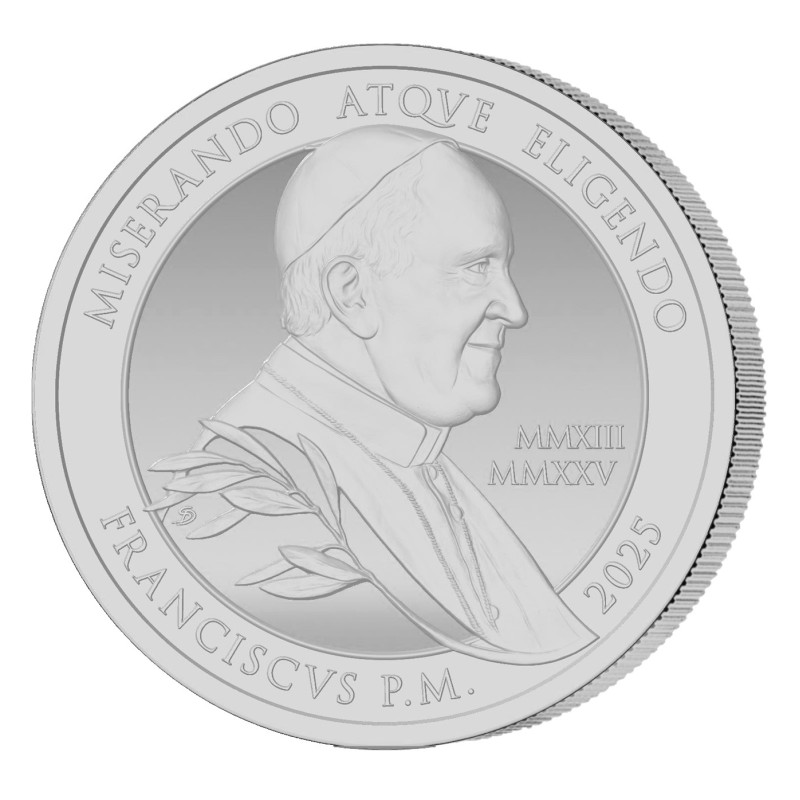 De officiële herdenkingsmunt is geslagen in de hoogste kwaliteit: Proof. Deze munt is verrijkt met een vriendelijk profielportret van de voormalige Argentijnse paus Franciscus. De romeinse cijfers verwijzen naar het jaar waarin hij paus werd (MMXIII) en als paus overleed (MMXXV). Het jaartal 2025 is behalve het jaar van uitgifte ook een Heilig Jaar. Franciscus P.M. betekent Franciscus Pontifex Maximus ofwel Franciscus - de Opperste Priester, de traditionele titel voor de paus.