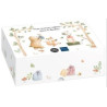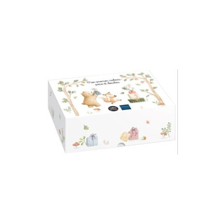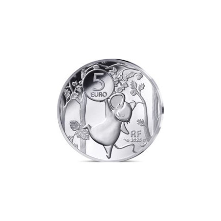 Op de voorkant van deze gekleurde 5€ zilveren BE munt, een nieuwe denominatie ontwikkeld voor deze collectie, is het hele team bijeen om een blijde gebeurtenis te vieren: de komst van een pasgeboren baby in het bos! Iedereen heeft cadeautjes en vrolijkheid meegebracht voor deze prachtige dag. Het beertje, vosje, konijntje en muisje komen tot leven door een selectieve storting van transparante inkt. Op de achterkant houdt een muisje een 5-euromunt vast, wat de nominale waarde van deze munt symboliseert. Het 'RF'-symbool, de jaardatum en de waarmerktekens bevinden zich aan de rechterkant. In samenwerking met het Franse merk Doudou et Compagnie biedt de Monnaie de Paris het en een knuffelkonijntje aan, beide gemaakt in Frankrijk. Het doosje kan later worden gebruikt als bewaardoosje voor alle schatten van je kind.