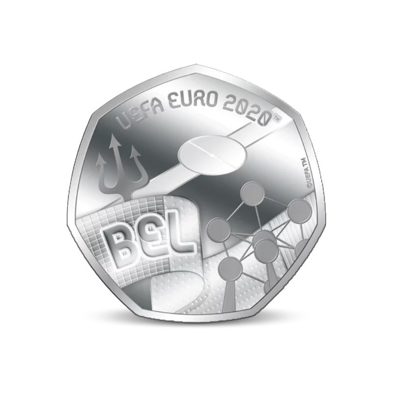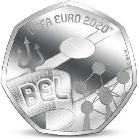 Op deze munt staat een wapperende vlag van België en de afkorting BEL. Verder zien we het monument het Atomium en een afbeelding van de drietand, een verwijzing naar het Belgische voetbalelftal de Rode Duivels.