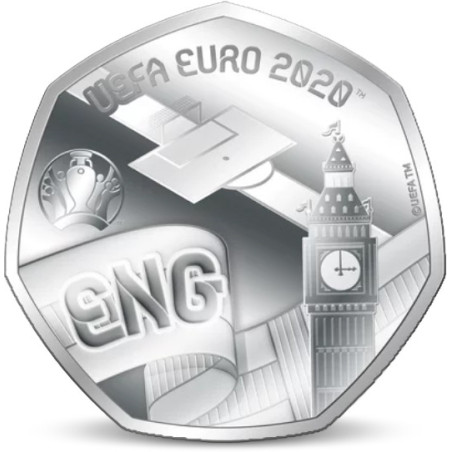 Op deze munt staat een wapperende vlag van Engeland en de afkorting ENG. Verder zien we de toren van het Palace van Westminster, beter bekend als Big Ben, en het EK 2020 logo.