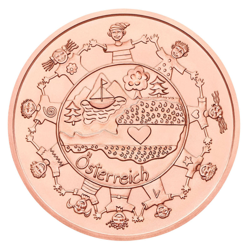 Deze munt van zuiver koper met Oostenrijk als thema is ontworpen door een basisschoolklas uit Kapfenberg. In het ontwerp staat een prachtig Alpenlandschap centraal, omringd door een cirkel van lachende kinderen die elkaars hand vasthouden. Het ontwerp versloeg 4.000 andere inzendingen in de nationale wedstrijd om de munt te ontwerpen. Op de andere zijde van de munt staan Oostenrijkse onderwerpen afgebeeld: De Grossglockner berg, keizer Franz Joseph I, een jonge Mozart, een skiër en Moeder en kind van schilder Gustav Klimt.