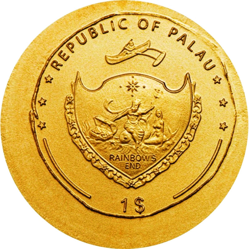Deze kleine gouden munt toont een Aureus met de gelauwerde kop van keizer Augustus (63 v.Chr. - 14 n.Chr.). Op de voorkant zien we het wapenschild van Palau en de nominale waarde "1 $" (USD).