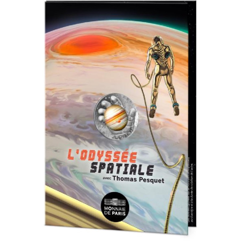 Op de voorzijde is Jupiter afgebeeld in de open palm van een astronaut. Op de achtergrond is een hemel vol sterren. Dit ontwerp geeft de toeschouwer de indruk in de helm van de astronaut te zitten, die erin geslaagd is de planeet vast te pakken om hem te bewonderen. die erin geslaagd is de planeet vast te pakken om hem te bewonderen. Langs de rand van de munt staan de woorden '139.822 km' en '9h55', die de diameter en rotatietijd van Jupiter voorstellen. Op de achterkant is de nominale waarde omringd door twee takken, een van eikenhout en de andere van laurier, die doen denken aan het eurosymbool. De hele achterkant wordt omlijst door 'République Française' en een reeks lijnen die de Zeshoek voorstellen. de zeshoek. De munt is verpakt in een cardlette met ontwerpen van Romain Hugault. Binnenin staan wetenschappelijke details over de planeet en op de achterkant een tekst van Thomas Pesquet.