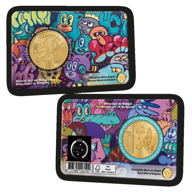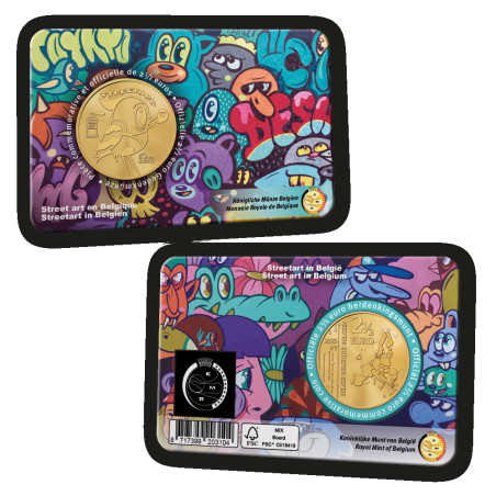 Many Belgian cities are literally putting street art on the map these days and more and more tours, festivals and apps are being devised to guide residents and tourists past all the art in public spaces. Now, in collaboration with five renowned Belgian street artists, an NFT* collection has been created and added to the coin issue in coincard. The collection consists of 2 x 5,000 special Belgian 2 ½ euro coins in coincard. The five street artists reflect well the various art styles adorning the walls of Belgian cities. Normally wall-sized, now available in a smaller format and in motion! 5,000 in NL coincard and 5,000 in FR coincard NFT by: Bue the Warrior – Buddies x 2,000 pieces NFT by: Lindert Steegen – Patterns of Time x 2,000 pieces NFT by: LobsterRobin – Monkey See, Monkey Demon x 2,000 pieces NFT by: Resto – Only Grass can save us x 2,000 pieces NFT by: Toys – Punk not Dead x 2,000 pieces