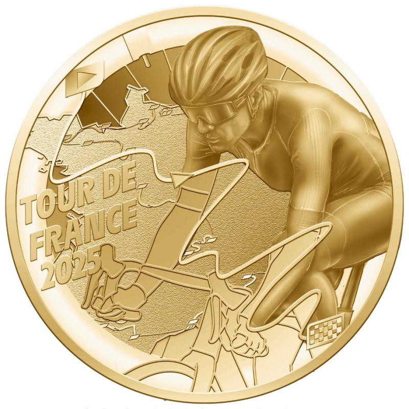 Centraal op de voorzijde van deze munt staat een fietsende wielrenner tegen de achtergrond van het officiële parcours van 2025, ingetekend op de kaart van Frankrijk binnen de contouren van een fietswiel met spaken. De beeltenis wordt in tweeën gedeeld door een lijn met een start- en finish-symbool ter illustratie van een etappe. Het thema staat in de kijkrichting van de wielrenner vermeld: TOUR DE FRANCE 2025.