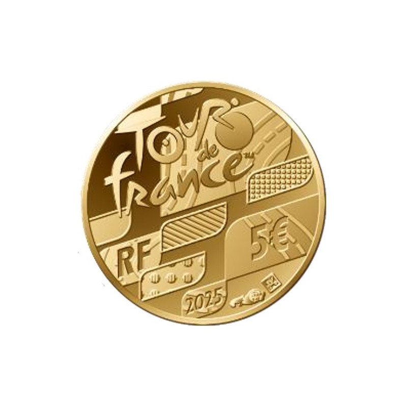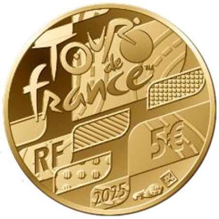 Op de gemeenschappelijke achterkant zijn onder het officiële Tour de France-logo de vier leiderstruien van het sportevenement in abstracte ovalen verbeeld: geel (effen), groen (puntjes), wit (lijnen) en bolletjes (stippen). De vlakken met wegmarkeringen symboliseren het asfaltparcours. Onderaan staan het land van afgifte (RF = République Française), het jaartal (2025), de waarmerken en de nominale waarde (5€) vermeld.