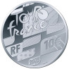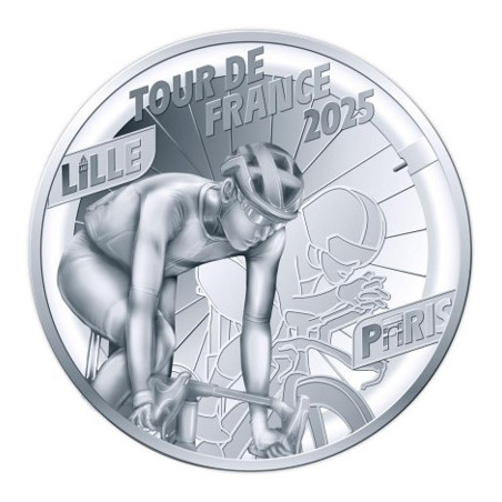 Op de voorkant van deze munt staat een wielrenner in volle inspanning centraal, gepositioneerd tussen de namen van de start- en finishlocaties: Lille – Paris. Achter deze realistische beeltenis is een tweede, gestileerde wielrenner als zijn schaduw zichtbaar. Hun verschil in lichaamshouding suggereert de diversiteit aan disciplines en geeft een gelaagd beeld van de Tour. Hun beeltenis wordt grotendeels omringd door een fietswiel met spaken. De ‘i’ in Lille is een subtiele verwijzing naar de Belfort-toren van het stadhuis in Lille, de ‘a’ in Paris verwijst naar de Arc de Triomphe in de hoofdstad. Het muntthema prijkt bovenaan: TOUR DE FRANCE 2025.