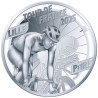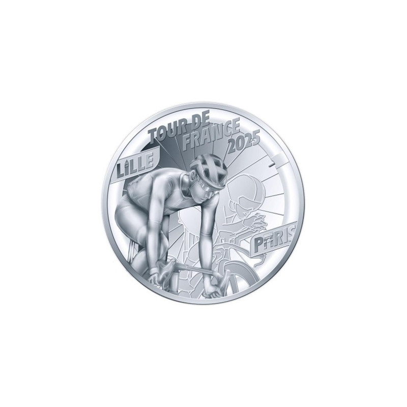 Op de voorkant van deze munt staat een wielrenner in volle inspanning centraal, gepositioneerd tussen de namen van de start- en finishlocaties: Lille – Paris. Achter deze realistische beeltenis is een tweede, gestileerde wielrenner als zijn schaduw zichtbaar. Hun verschil in lichaamshouding suggereert de diversiteit aan disciplines en geeft een gelaagd beeld van de Tour. Hun beeltenis wordt grotendeels omringd door een fietswiel met spaken. De ‘i’ in Lille is een subtiele verwijzing naar de Belfort-toren van het stadhuis in Lille, de ‘a’ in Paris verwijst naar de Arc de Triomphe in de hoofdstad. Het muntthema prijkt bovenaan: TOUR DE FRANCE 2025.