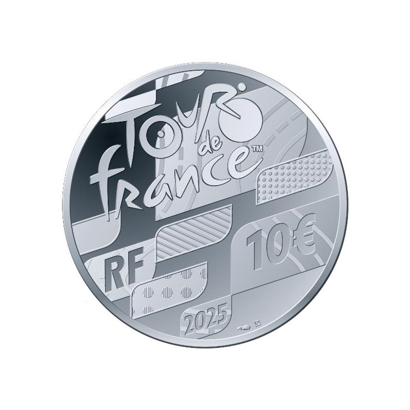 Op de gemeenschappelijke achterkant zijn onder het officiële Tour de France-logo de vier leiderstruien van het sportevenement in abstracte ovalen verbeeld: geel (effen), groen (puntjes), wit (lijnen) en bolletjes (stippen). De vlakken met wegmarkeringen symboliseren het asfaltparcours. Onderaan staan het land van afgifte (RF = République Française), het jaartal (2025), de waarmerken en de nominale waarde (10€) vermeld.